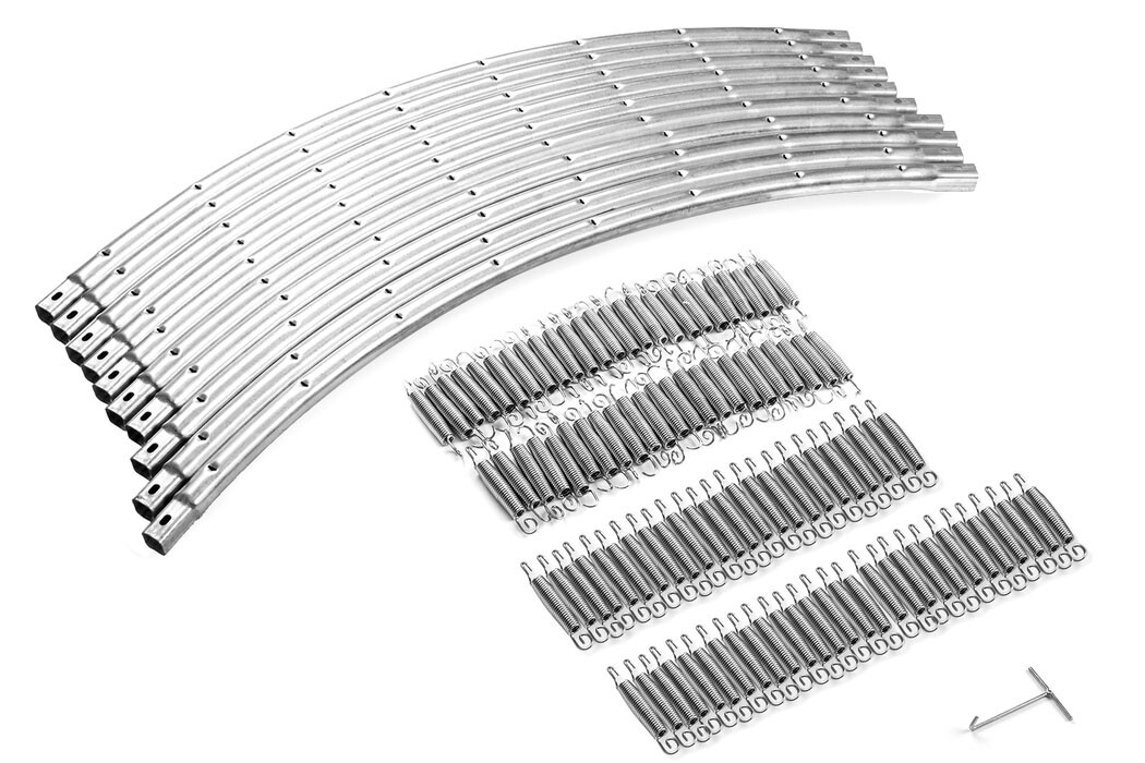 - Пружин. В модели батута Atlas Sport 312см их 64 штуки. Они крепятся к прыжковому полотну треугольными карабинами. Карабины, в свою очередь, надеты на петли, каждая из которых пристрочена к кругу восемью фабричными швами. Обрыв петли, отсоединение пружины исключены.