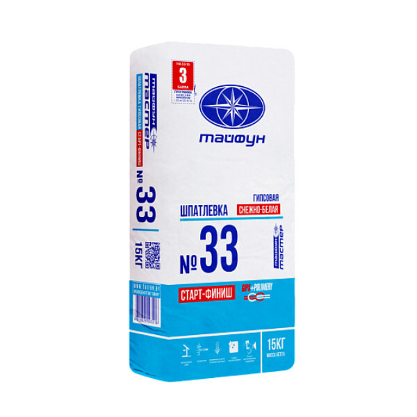 Шпатлевка гипсовая "Тайфун Мастер" №33 белая 20 кг - это высококачественный материал для финишной отделки внутренних поверхностей. Данный состав разработан специально для выравнивания стен и потолков из различных материалов, включая гипсокартонные и гипсоволокнистые плиты, гипсовые, известково-цементные и цементные штукатурки, а также бетонные поверхности. Помимо основной функции выравнивания, шпатлевка эффективно справляется с заделкой мелких дефектов, таких как выбоины и сколы, а также может использоваться для заполнения швов между листами ГКП и ГВП.