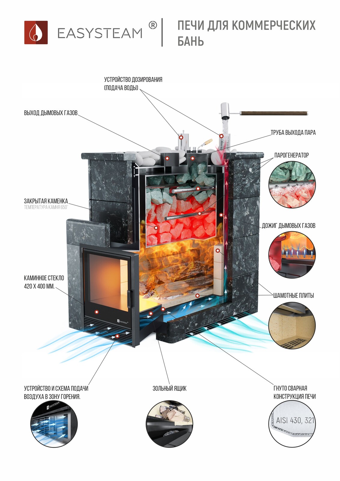 Печь оснащена съёмной закрытой каменкой, позволяющей разогревать находящиеся в ней камни до температуры 600 градусов.