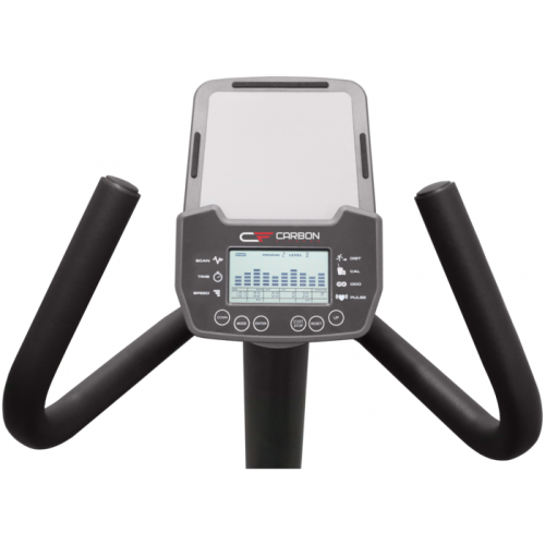 Многофункциональный LCD-дисплей представляет собой небольшой компьютер и имеет "на борту" массу полезного функционала. На выбор представлены 13 разноплановых встроенных программ, в которых используются различные виды тренировок - снижение веса, сжигание жира, выносливость, подъем в гору, интервальная тренировка, циклическая тренировка, аэробная тренировка, фартлек, увеличение нагрузки, равнина, долина, плато, холмы. Для каждой из встроенных программ можно выставить цели в виде дистанции, времени и количества сжигаемых калорий - при достижении одного из этих показателей тренировка завершится. Есть здесь и ручной режим, где пользователь самостоятельно регулирует уровни нагрузки в процессе занятия. На экран компьютера выводятся различные параметры - непосредственно профиль тренировки, время, дистанция, скорость, калории, обороты в минуту, одометр, пульс и Ватты. За показатели пульса отвечают вмонтированные в рукоятки сенсорные датчики пульса.