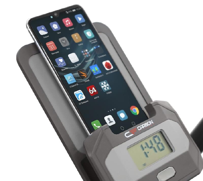 За показатели пульса отвечают вмонтированные в рукоятки сенсорные датчики. Рифленые антискользящие педали с прорезиненными многопозиционными ремешками обеспечивают надежное сцепление на любых скоростях педалирования. Благодаря компенсаторам неровностей пола можно легко выровнять положение велотренажера на неровной поверхности. Переместить тренажер также не составляет большого труда - для этого предусмотрены транспортировочные ролики. Небольшой, но важной опцией является подставка под смартфон - это отличный способ справиться с однообразием тренировочного процесса.