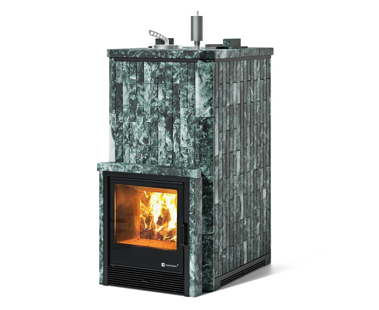 Южная - банная печь с уникальным узлом дожига дымовых газов , который обеспечивает более полное сгорание дров и и, как следствие, снижение расхода дров до 30%. Печь оснащена съемной закрытой каменкой, топка печи футерована шамотными плитами. В стандартную комплектацию печи входит индивидуально разработанный кожух из натурального камня толщиной 40 мм с регулируемой конвекцией.