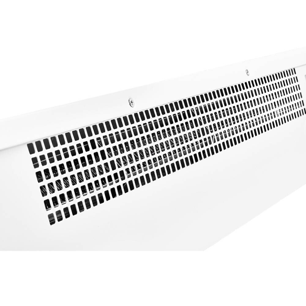 Передняя панель без перфорации блокирует распространение шума от вентиляционных колес направляя его в потолок, а не в проходящих людей, что делает завесу значительно тише аналогов в классическом корпусе.
